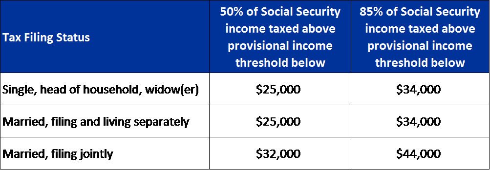 If your "provisional income" exceeds the thresholds below, a percentage of your Social Security benefit will be taxed. For example, for married couples filing jointly, if your provisional income is between $32,000 and $44,000, you will be taxed on 50% of your Social Security benefit.