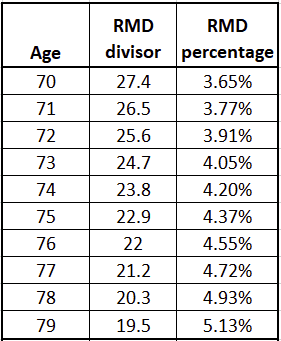 At age 72, your RMD is 1/25.6th (or 3.91%) of the IRA value ending December 31st of the previous year. At age 79, it is 1/19.5th (or 5.13%) of the IRA value ending December 31st of the previous year. The divisor is your “statistical life expectancy”, so you are are dividing your IRA assets by the supposed average number of years someone your age is expected to live.