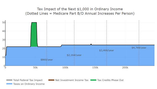 These higher taxes and/or Medicare premiums occur at different income levels. The example above shows the tax credit phase-out and Medicare premium increases for this retiree’s income range. It shows how much you can convert before hitting the various thresholds and the tax consequences. It may be that you’d want to reduce your conversion amount just enough to be under these tax triggering income levels. It depends on the how much it offsets the conversion’s benefit.