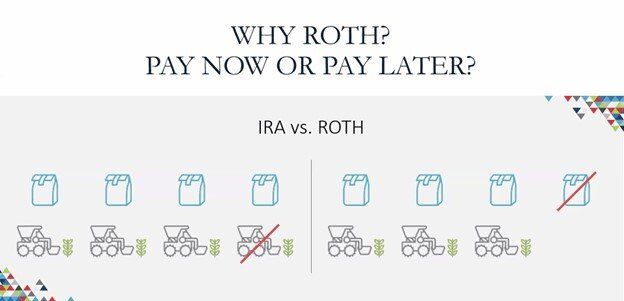 This chart above shows equal outcomes if growth and tax rates are equal. But if the government takes 25% of your seeds now but would take only 20% of the produce later, it would be wise to plant all the seeds now (equivalent of the IRA). If the government would take 25% of your seeds now but take 30% of your crops later, you would let them take 25% of your seeds so you can keep all your crops (equivalent of the Roth IRA).